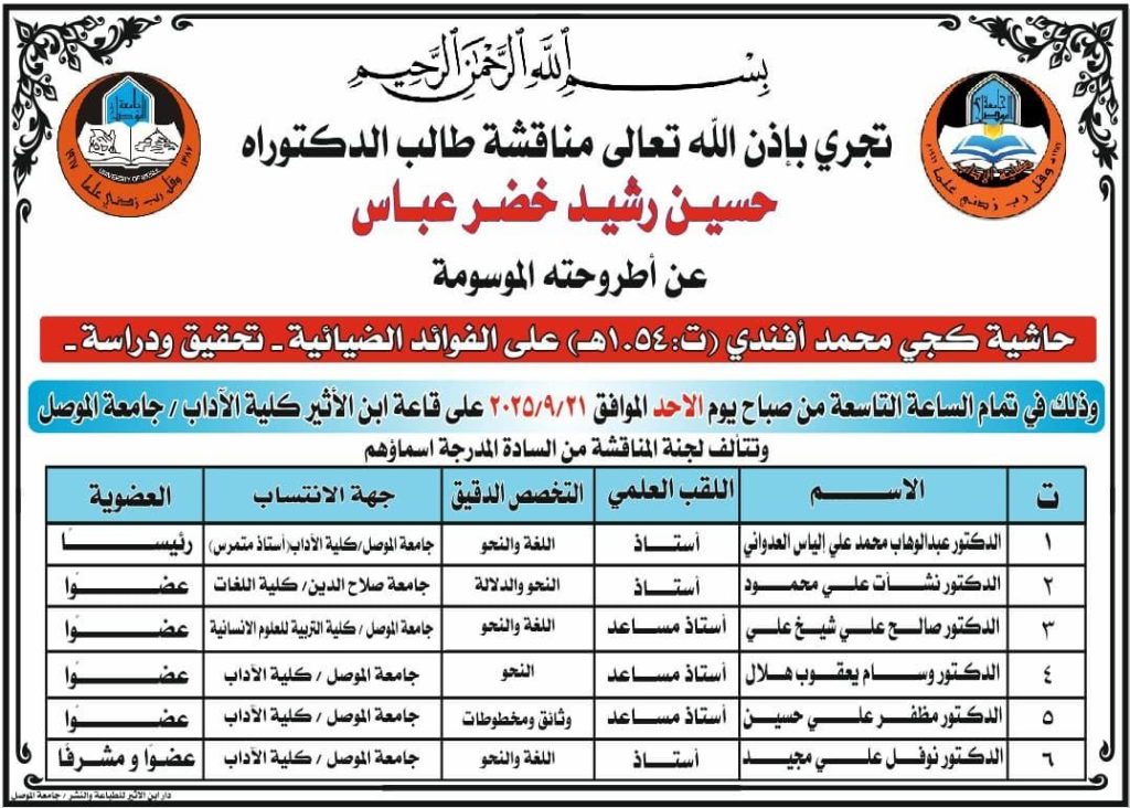 حصلَ التدريسي في كلية التربية الأساسية – جامعة تلعفر، المدرس المساعد (حسين رشيد خضر)، على شهادة الدكتوراه من كلية الآداب – جامعة الموصل في اختصاص اللغة العربية، وذلك عن أطروحته الموسومة:(حاشية كُجِي محمد أفندي (ت 1054هـ) على الفوائد الضيائية – تحقيق ودراسة).وجرت المناقشة بحضور لجنة علمية متخصّصة، أشادت بجهود الباحث وأهمية موضوعه وما قدّمه من إضافة نوعية في مجاله العلمي، ومنحته على أثرها شهادة الدكتوراه بتقدير (جيد جداً).وبهذه المناسبة، تتقدّم كلية التربية الأساسية – جامعة تلعفر بأحر التهاني وأجمل التبريكات إلى زميلها الكريم، متمنيةً له دوام التوفيق والنجاح في مسيرته الأكاديمية والعلمية.