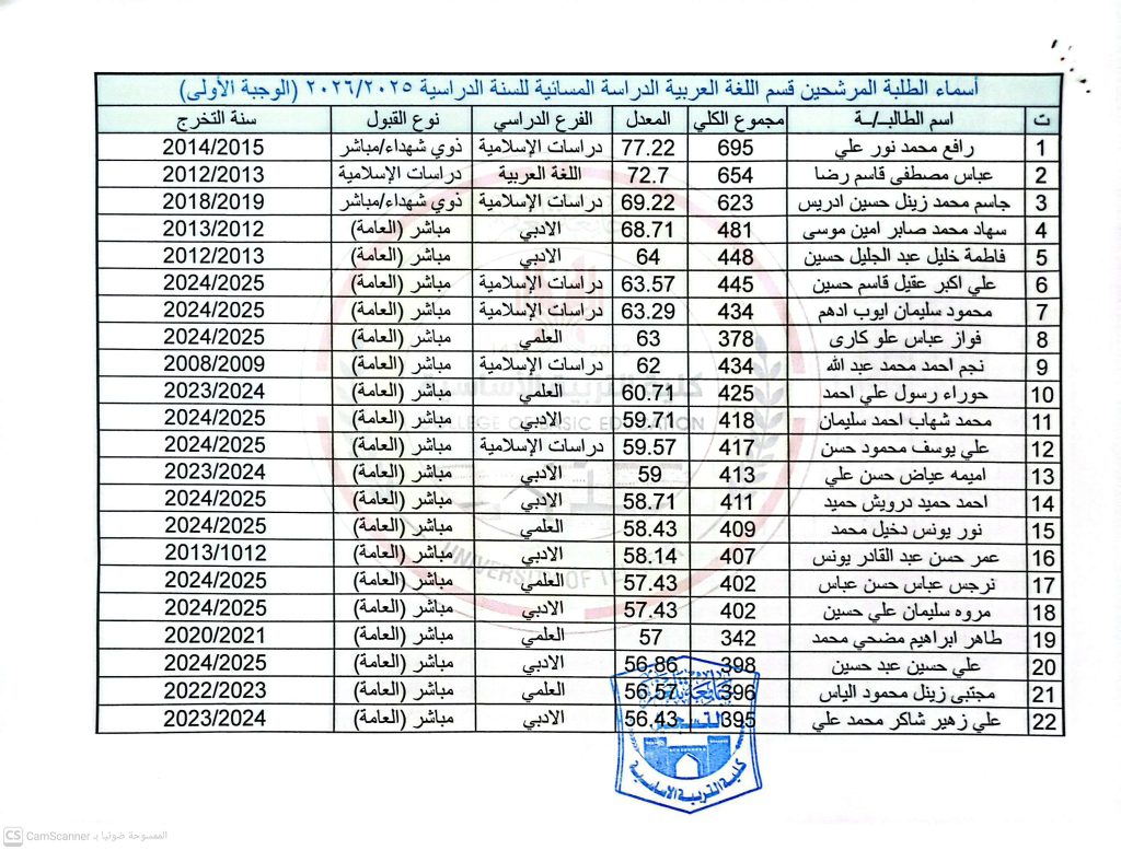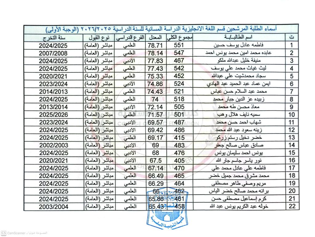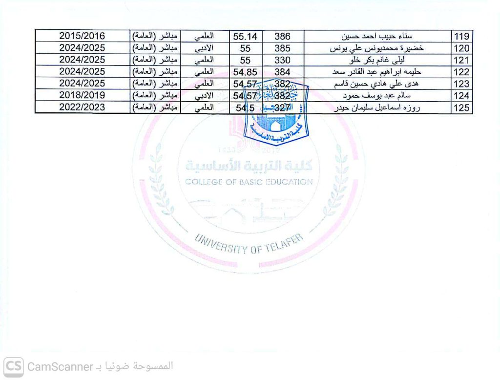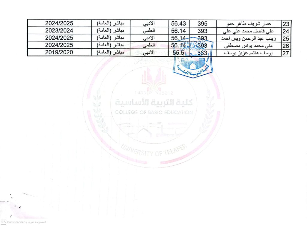 تعلن كلية التربية الاساسية في جامعة تلعفر عن اسماء المرشحين للقبول في الدراسة المسائية (القناة العامة) الوجبة الاولى للسنة الدراسية 2025-2026على الطلبة المقبولين مراجعة الكلية لغرض التسجيل ابتداءً من صباح يوم الأربعاء الموافق 5/ 11/ 2025 ولغاية نهاية الدوام الرسمي ليوم الاحد الموافق 2025/11/9.