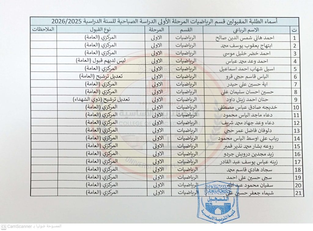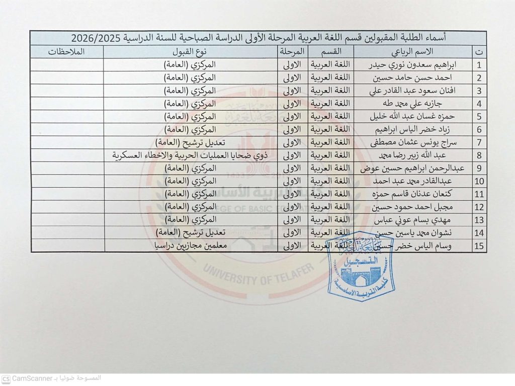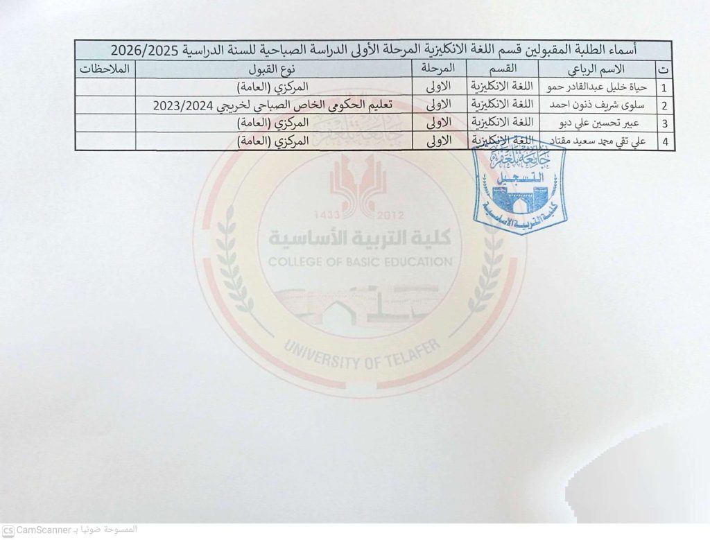 تعلن عمادة كلية التربية الأساسية/ جامعة تلعفر عن اعلان نتائج القبول المركزي للدراسة الصباحية للعام الدراسي (٢٠٢٥ -٢٠٢٦) موزعين بحسب أقسام الكلية.