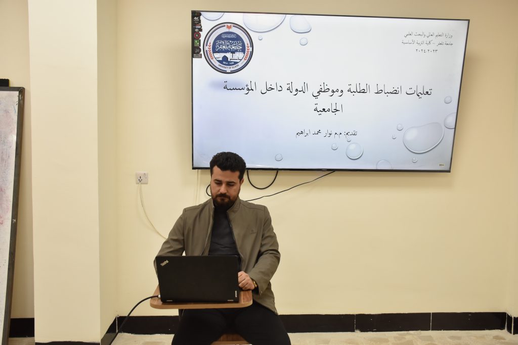 برعاية الأستاذ الدكتور خليل خضر عبو، عميد الكلية، نظّم قسم اللغة العربية بالتعاون مع وحدة الإرشاد النفسي والتوجيه التربوي ورشة عمل توعوية بعنوان “تعليمات انضباط الطلبة وموظفي الدولة داخل الحرم الجامعي ،قدّم الورشة المدرس المساعد نوار محمد إبراهيم يوم الأربعاء الموافق 3/12/2025 لطلبة المرحلة الأولى.