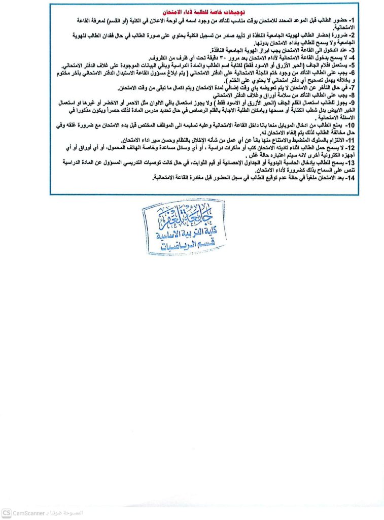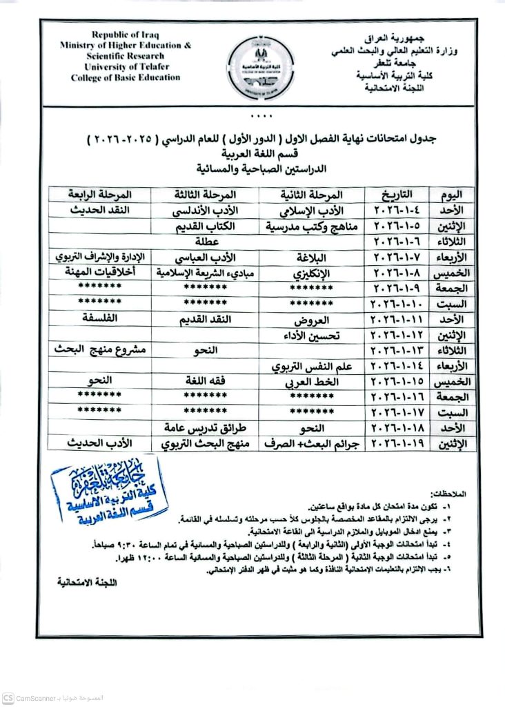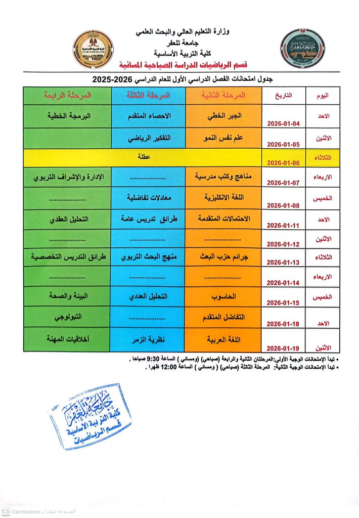 تُعلن عمادة كلية التربية الأساسية جدول امتحانات نهاية الفصل الدراسي الأول (الدور الأول) لقسمي الرياضيات واللغة العربية، وللدراستين الصباحية والمسائية، للعام الدراسي 2025 / 2026.