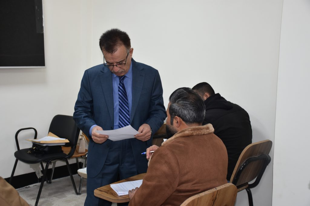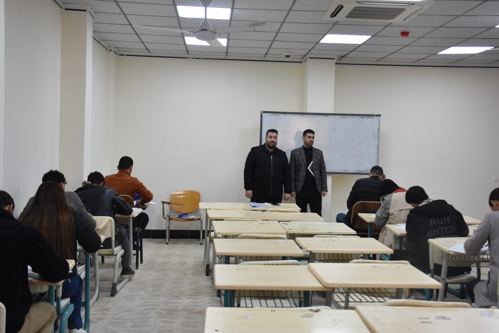 وتفقد السيد عميد الكلية، برفقة السادة المعاونين والسادة رؤساء الأقسام، القاعات الامتحانية للاطلاع على سير الامتحانات والتأكد من تهيئة المستلزمات كافة، وعدم وجود أي معرقلات إدارية أو علمية قد تؤثر في العملية الامتحانية.