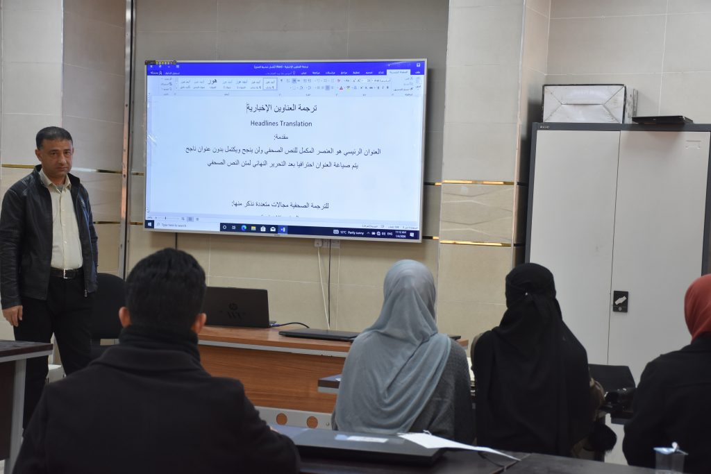 برعاية الأستاذ الدكتور خليل خضر عبو، عميد الكلية، أقام قسم اللغة الإنجليزية حلقةً دراسية بعنوان «ترجمة العناوين الإخبارية»، ألقاها التدريسي م. محمد جاسم محمد وهب، يوم الأحد الموافق 4 كانون الثاني 2026، بحضور طلبة قسم اللغة الإنجليزية.