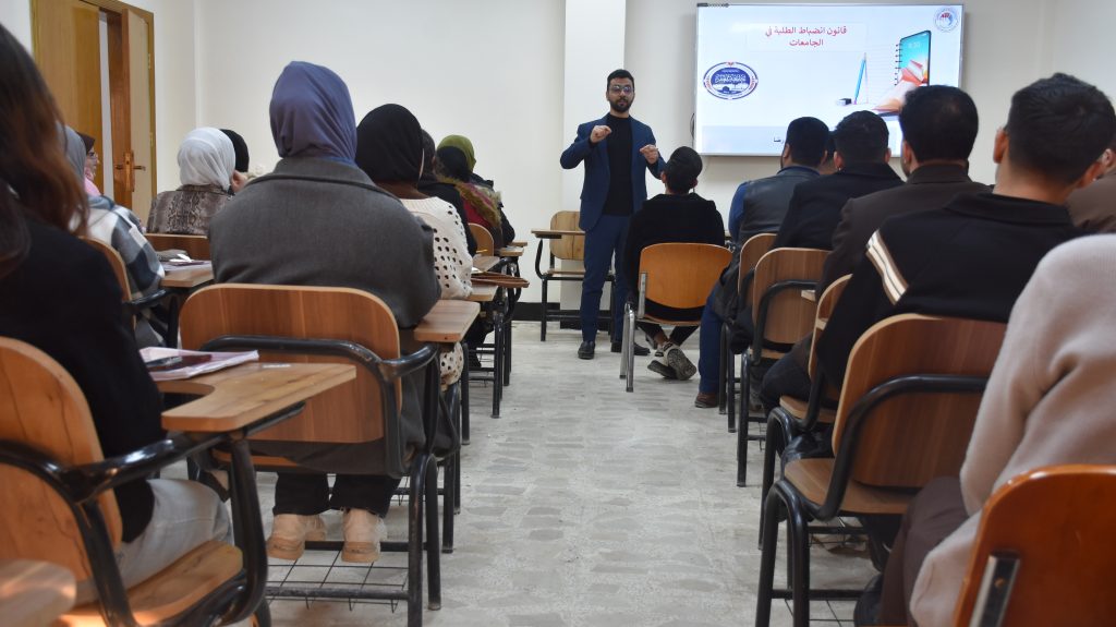 وهدفت الندوة إلى تعزيز الوعي بقانون انضباط الطلبة في العراق، وترسيخ ثقافة الالتزام بالقوانين والأنظمة الجامعية، وبيان حقوق وواجبات الطلبة، بما يسهم في الحد من المخالفات السلوكية، وتهيئة بيئة جامعية آمنة ومنظمة تسهم في دعم العملية التعليمية وتحقيق العدالة داخل الجامعة.