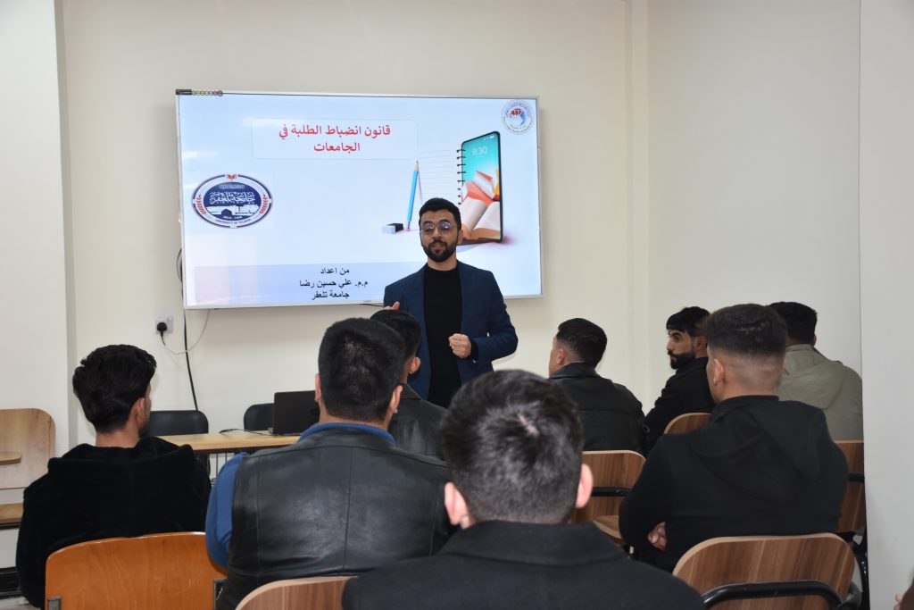 أقام قسم اللغة الإنجليزية ندوة علمية بعنوان “قانون انضباط الطلبة في الجامعات”، قدّمها المدرس المساعد علي حسين رضا، وذلك يوم الأحد الموافق 25 كانون الثاني 2026، وبحضور طلبة المرحلة الأولى.