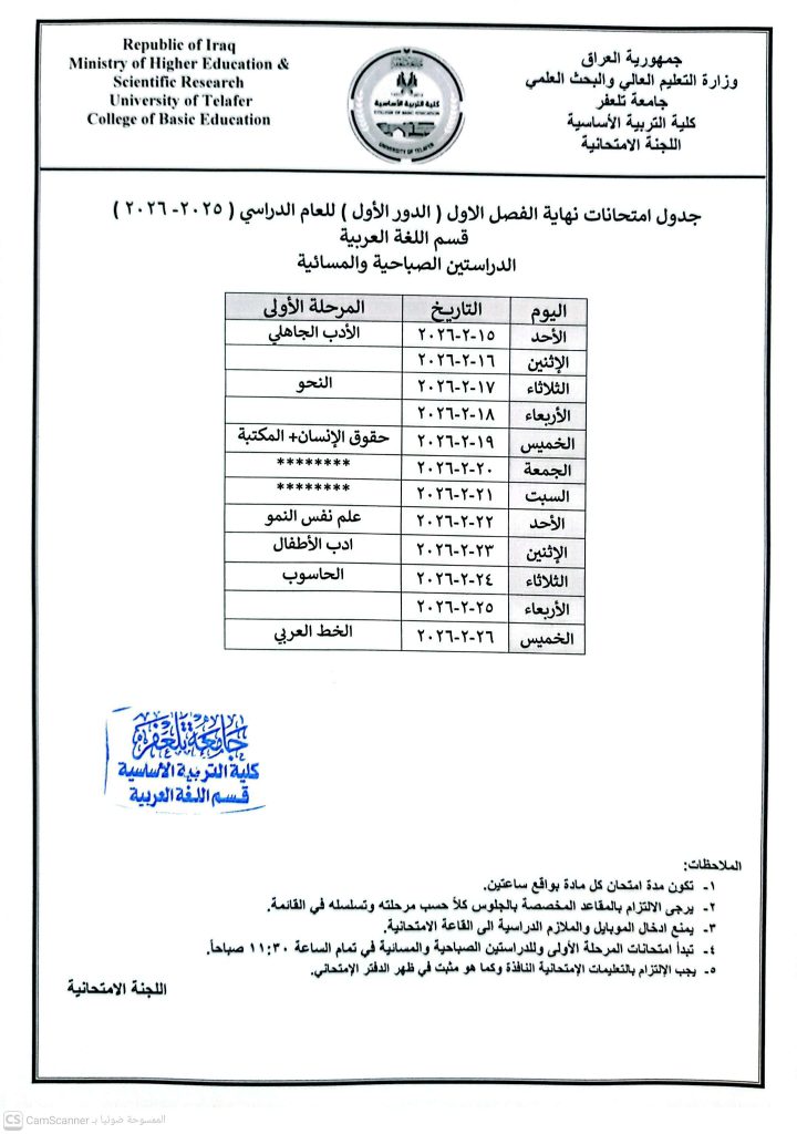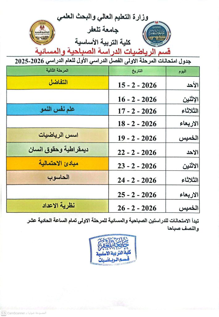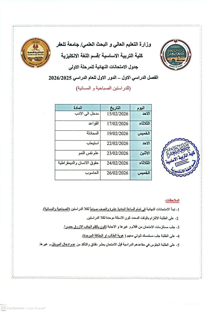 تُعلن عمادة كلية التربية الأساسية جدول امتحانات نهاية الفصل الدراسي الأول (الدور الأول) لطلبة المرحلة الأولى في أقسام الرياضيات واللغة العربية واللغة الإنجليزية، وللدراستين الصباحية والمسائية، للعام الدراسي 2025–2026.