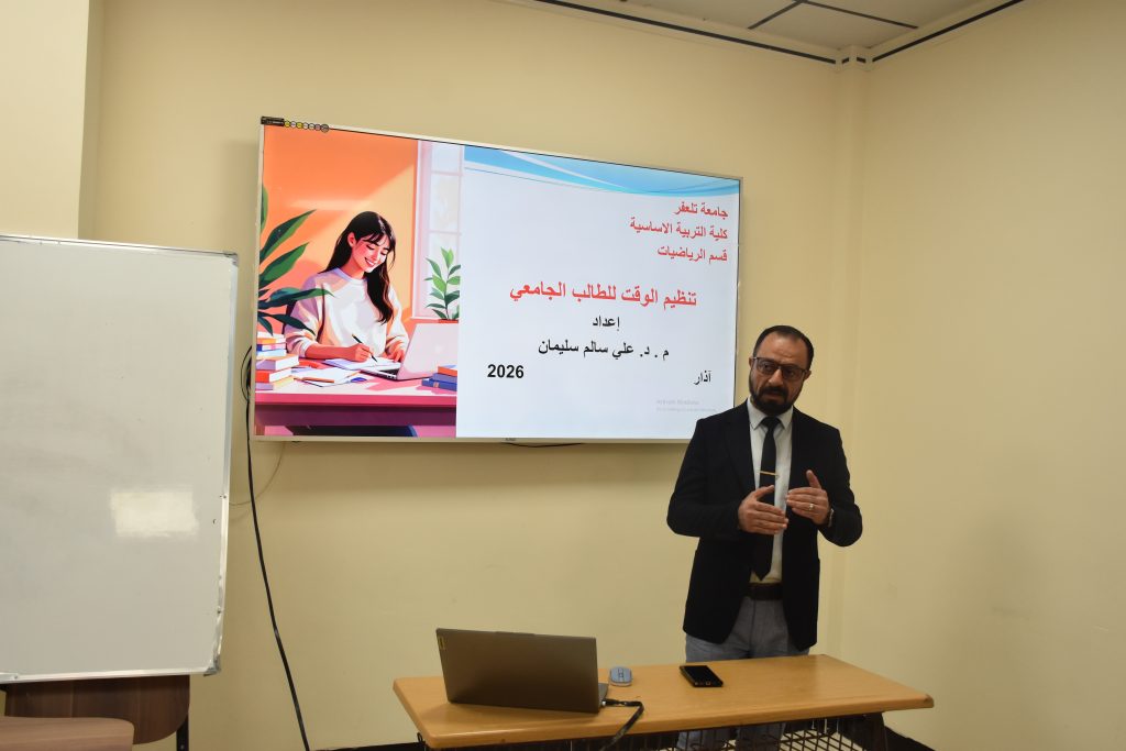 برعاية عمادة كلية التربية الأساسية في جامعة تلعفر، نظّم قسم الرياضيات محاضرةً إرشادية بعنوان “تنظيم الوقت للطالب الجامعي”، قدّمها الدكتور علي سالم سليمان، وذلك يوم الأربعاء الموافق 4 / 3 / 2026، بحضور عدد من طلبة كلية التربية الأساسية.