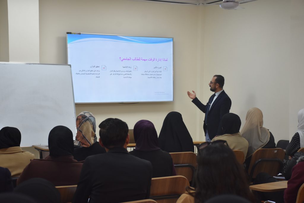 وهدفت المحاضرة إلى تعزيز مهارات الإدارة الفعّالة والمنظمة للوقت لدى الطالب الجامعي، بما يسهم في تحقيق التوازن بين التحصيل الأكاديمي والحياة الشخصية، من خلال رفع المستوى العلمي، وتقليل التوتر، وتجنّب التسويف، وإنجاز الواجبات ضمن المواعيد المحددة، مع بيان أهمية الوقت وضرورة استثماره علمياً وعملياً بالشكل الأمثل.
