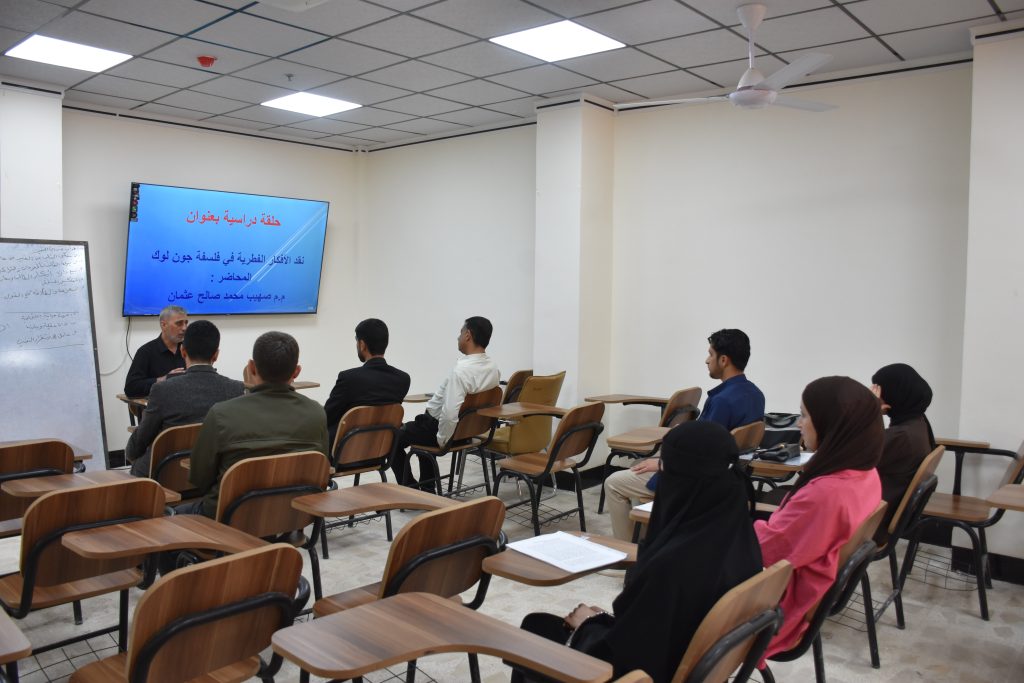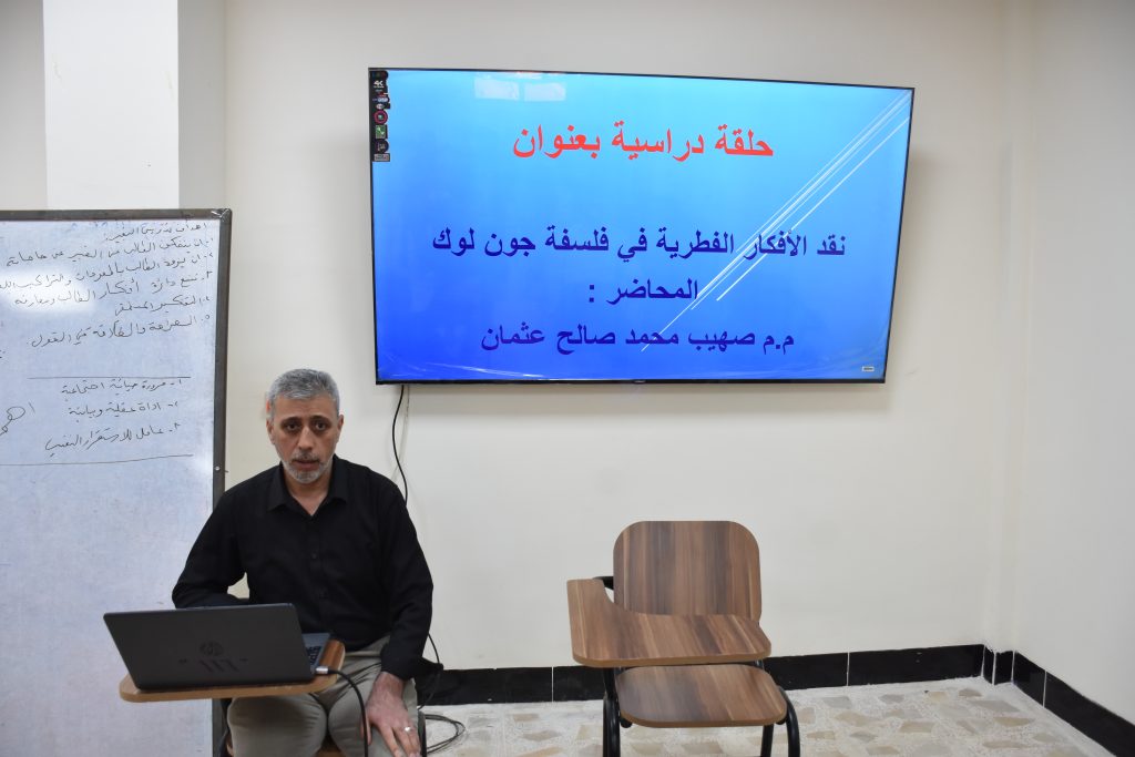 برعاية عمادة كلية التربية الأساسية، نظّم قسم اللغة الإنجليزية حلقةً دراسيةً بعنوان: «نبذ الأفكار الفطرية في فلسفة جون لوك»، قدّمها المدرّس المساعد صهيب محمد صالح عثمان، وذلك يوم الخميس الموافق 21 نيسان 2026، وبحضور طلبة القسم.