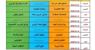 تُعلن عمادة كلية التربية الأساسية جدول امتحانات نهاية الفصل الدراسي الأول (الدور الأول) لقسمي الرياضيات واللغة العربية، وللدراستين الصباحية والمسائية، للعام الدراسي 2025 / 2026. نتمنى لجميع طلبتنا الأعزاء التوفيق والنجاح الدائم.